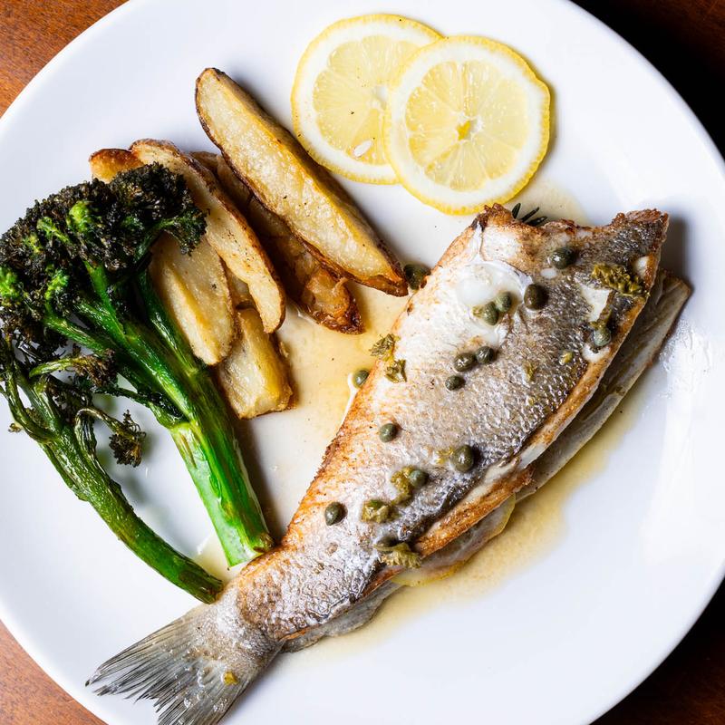 Seared Mediterranean sea bass, lemon caper sauce, caponata.